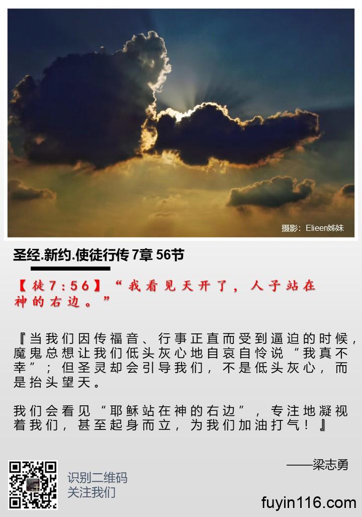 当我们因传福音、行事正直而受到逼迫的时候,魔鬼总想让我们低头灰心地自哀自怜说“我真不幸”,但圣灵引导我们,不要低头灰心,而是抬头望天,我们会看见“耶稣站在 神的右边”。