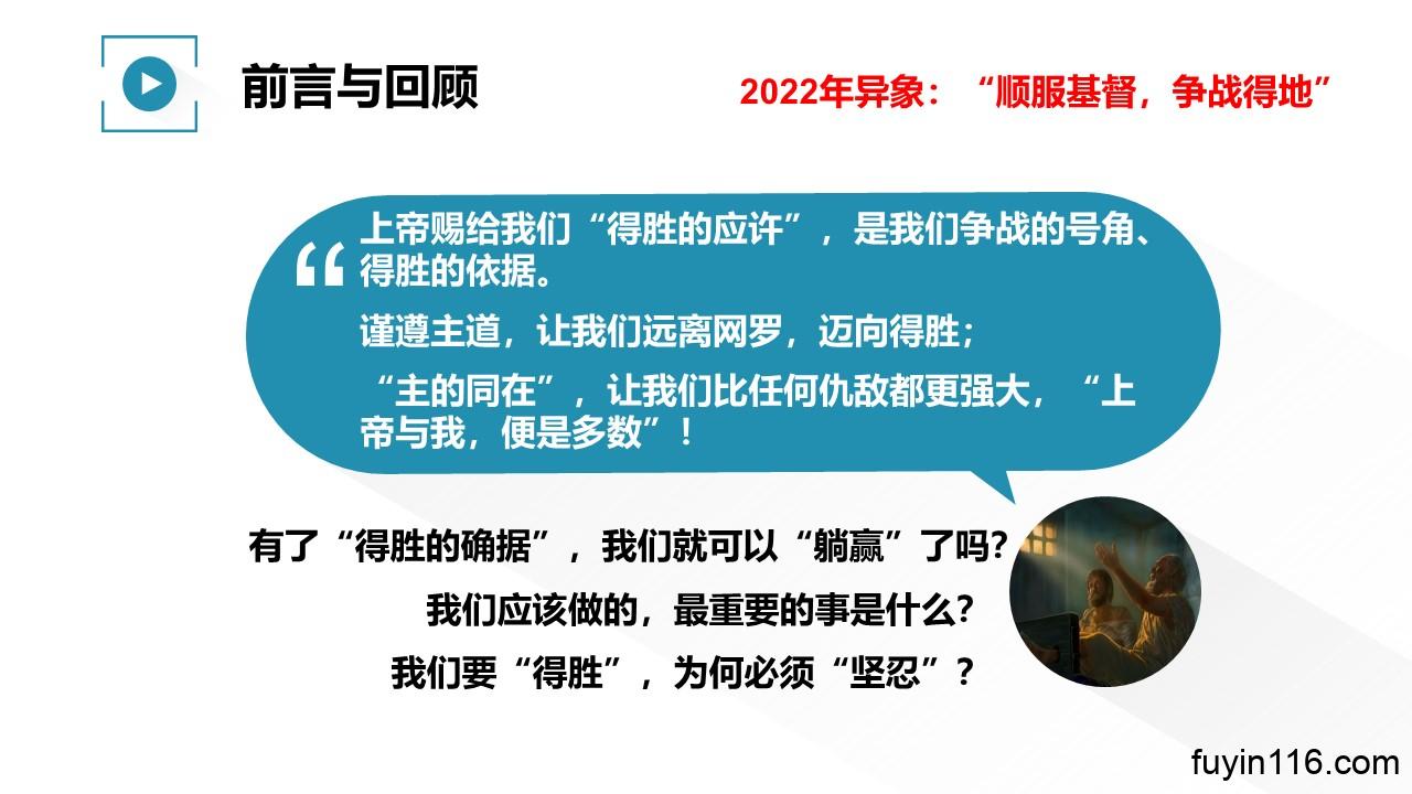 上一讲的信息《得胜的确据》中,我们知道,我们之所以有必胜的信心,是因为上帝给我们“得胜的确据”,祂给我们“得胜的应许”、“制胜之道”和“与我们同在”的保证。