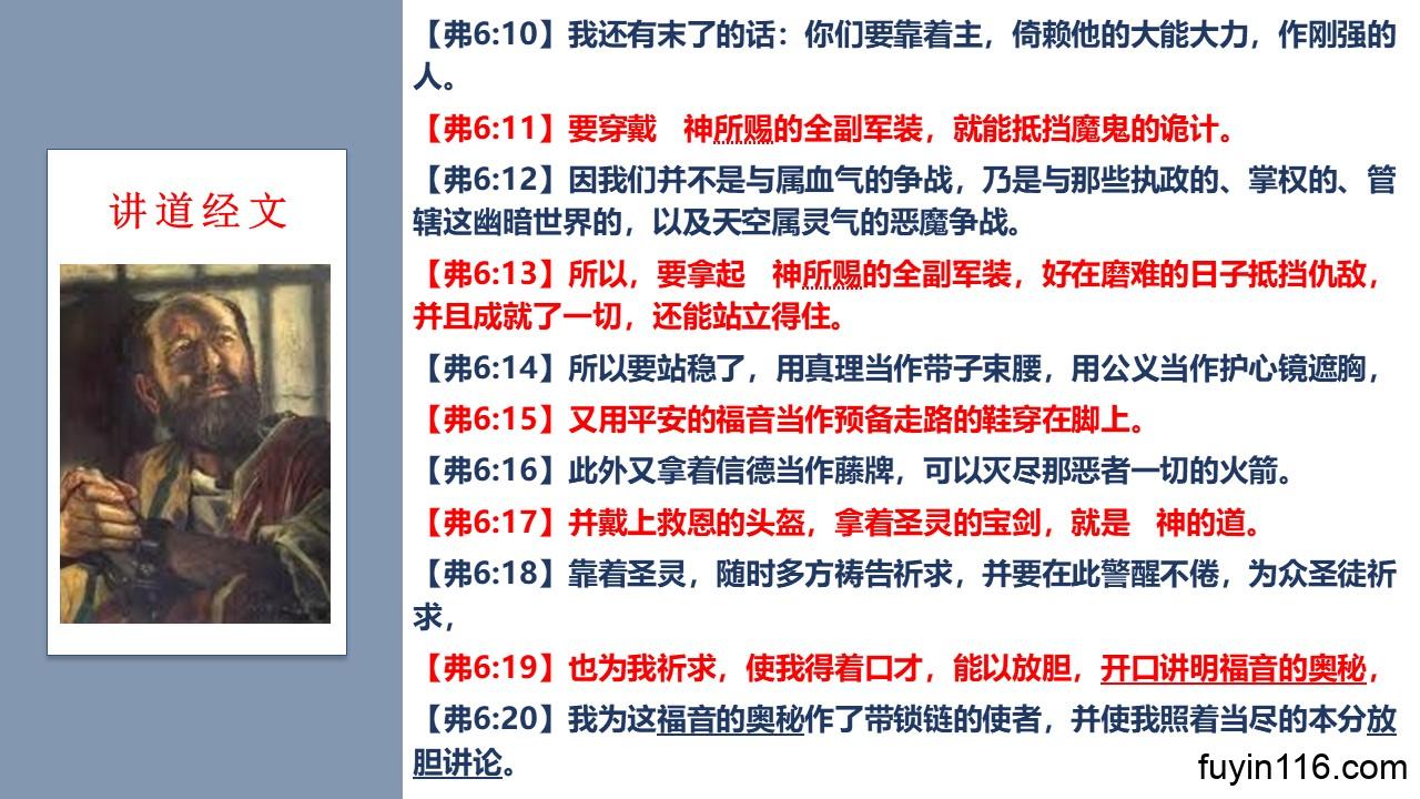 在全副军装的经文中,保罗两次请求为他放胆讲明福音的奥秘而祷告。