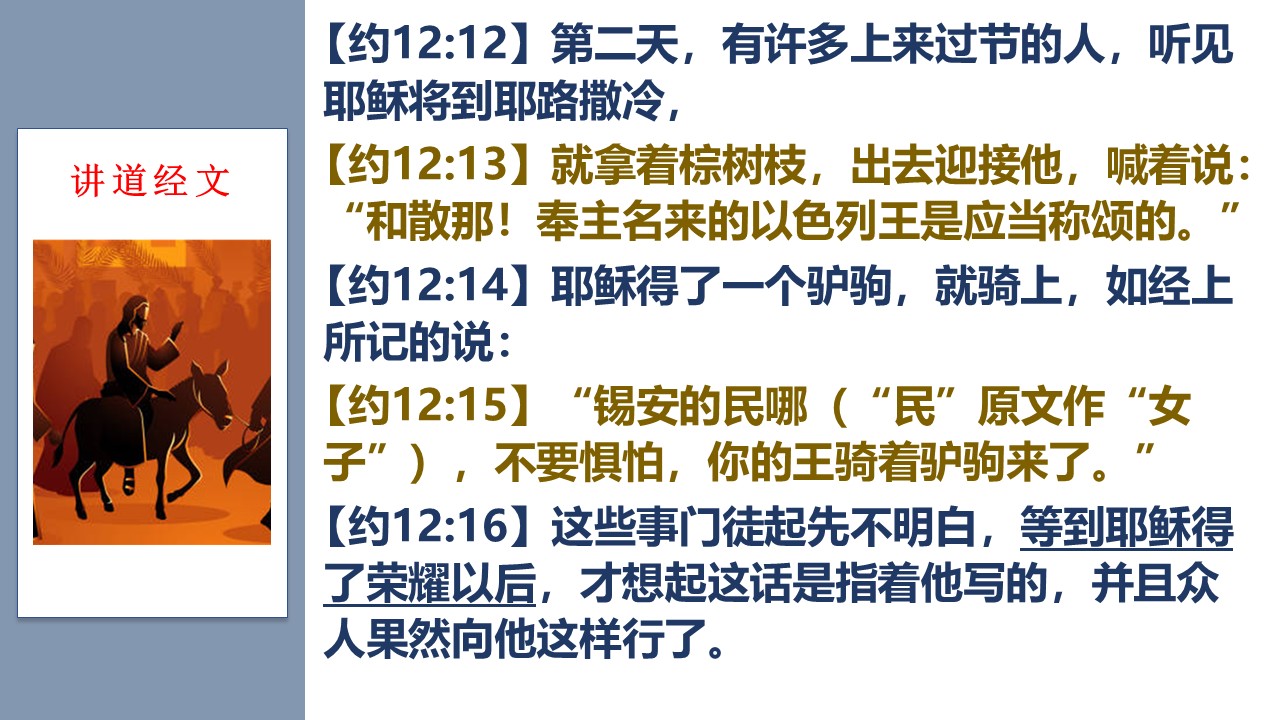 在主基督“荣入圣城”前后发生了三件事,这三件事分别告诉我们哪些“荣耀君王”基督的真理?