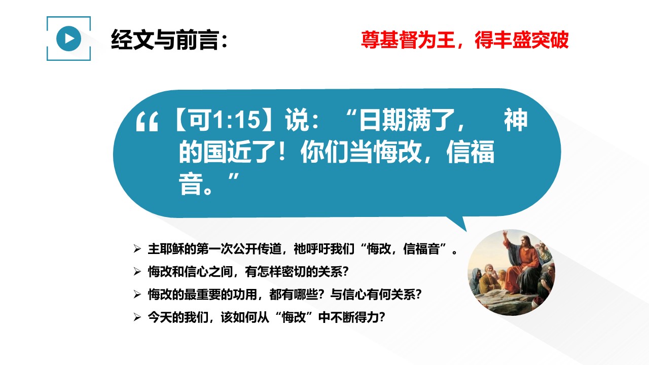 主耶稣的第一次公开传道,祂呼吁我们“悔改,信福音”。