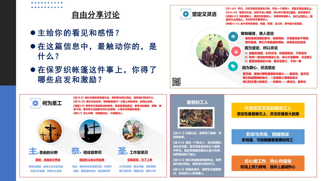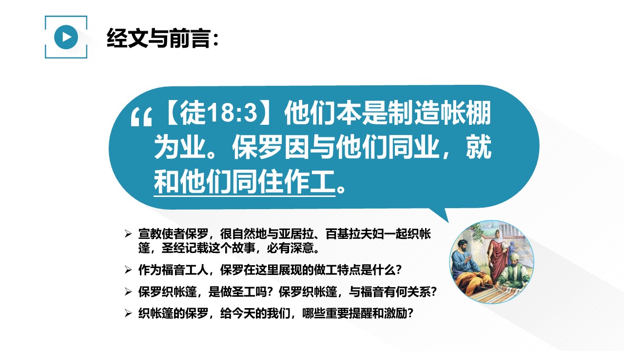 宣教使者保罗,很自然地与亚居拉、百基拉夫妇一起织帐篷,圣经记载这个故事,必有深意。