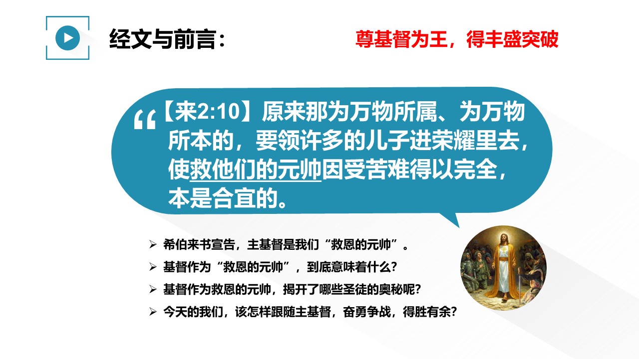 希伯来书2章10节宣告,主基督是我们“救恩的元帅”。