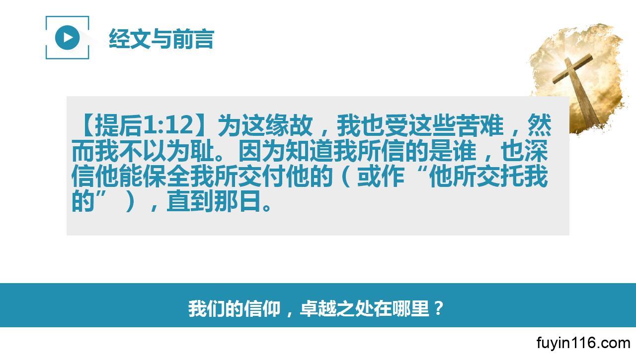【提后1:12】为这缘故,我也受这些苦难,然而我不以为耻。因为知道我所信的是谁,也深信他能保全我所交付他的(或作“他所交托我的”),直到那日。