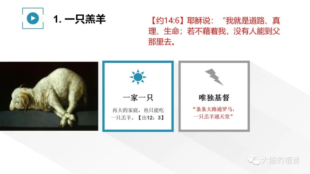 请听《条条大路通罗马,一只羔羊通天堂--梁志勇》 【出12:3】你们吩咐以色列全会众说:本月初十日,各人要按着父家取羊羔,一家一只。 【出12:4】若是一家的人太少,吃不了一只羊羔,本人就要和他隔壁的邻舍共取一只。你们预备羊羔,要按着人数和饭量计算。 请注意,以色列每家吃羔羊的时候,可以吃几只?大家族可以吃多只吗? 不!即便是一个大家族,也不可以宰两只羊羔,只能是一只。 上帝为什么有这样的安排,为什么有这么严格的要求? 因为上帝要让我们明白一个重要的救恩真理: ——救恩唯独出于羔羊基督。 就如主耶稣说的: 【约14…