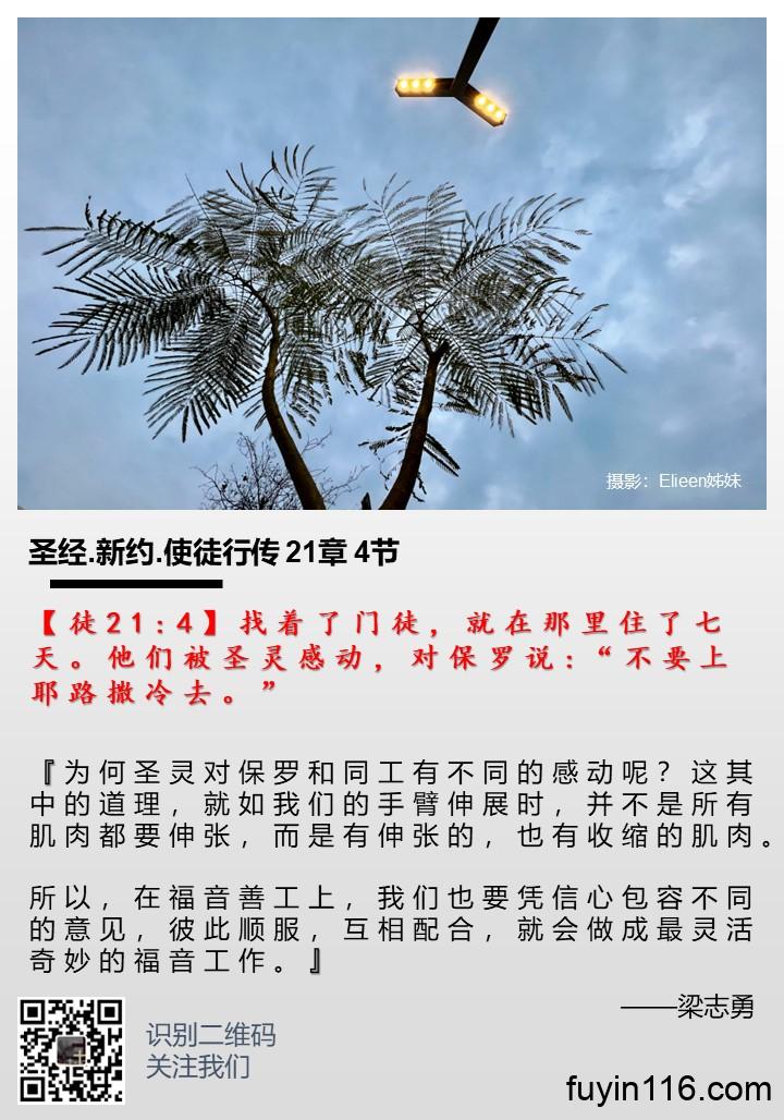 【徒21:4】找着了门徒,就在那里住了七天。他们被圣灵感动,对保罗说:“不要上耶路撒冷去。” 《看似矛盾,却是协调》 作者:梁志勇牧师 朗诵:倩文师母 看似矛盾,却是协调 (梁志勇) 【徒21:4】找着了门徒,就在那里住了七天。他们被圣灵感动,对保罗说:“不要上耶路撒冷去。” 我们都知道,保罗是被圣灵感动,要去耶路撒冷;但这里也明确说,推罗的门徒们也是“被圣灵感动”劝保罗“不要上耶路撒冷”。 这是怎么回事呢? 同一位圣灵,为什么感动保罗去耶路撒冷,同时又感动门徒劝保罗不要去呢?圣 灵不是谎言的灵,保罗…