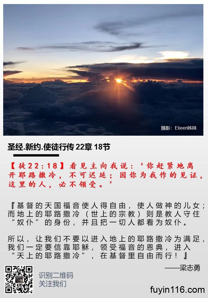 【徒22:18】看见主向我说:‘你赶紧地离开耶路撒冷,不可迟延;因你为我作的见证,这里的人,必不领受。’ 《地上的耶路撒冷》 作者:梁志勇牧师 朗诵:倩文师母 地上的耶路撒冷 (梁志勇) 【徒22:18】看见主向我说:‘你赶紧地离开耶路撒冷,不可迟延;因你为我作的见证,这里的人,必不领受。’ 保罗所传的“因信称义”福音,对万民都是极其宝贵的。他又勇敢为耶稣基督作见证,他的讲道具有极大的感召力。我们本来期望着,他在耶路撒冷应该受到热烈的欢迎,受到众人的嘉许。 但情况正好相反,保罗在耶路撒冷遇到的逼迫,…