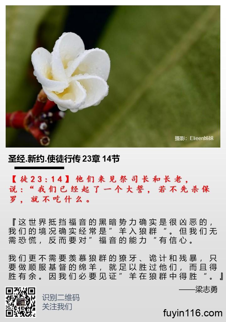 【徒23:14】他们来见祭司长和长老,说:“我们已经起了一个大誓,若不先杀保罗,就不吃什么。 《羊在狼群中得胜》 作者:梁志勇牧师 朗诵:倩文师母 羊在狼群中得胜 (梁志勇) 【徒23:14】他们来见祭司长和长老,说:“我们已经起了一个大誓,若不先杀保罗,就不吃什么。 前一天,法利赛人和撒都该人还在为了“复活”的问题彼此争执,但只过了一天,他们就合谋要杀死保罗。 从此,我们看到主耶稣说的“我差你们如同羊进入狼群”真是不错的,这世界抵挡福音的黑暗势力确实很凶恶。 但祂差我们“羊入狼群”,却不是要让我们被…