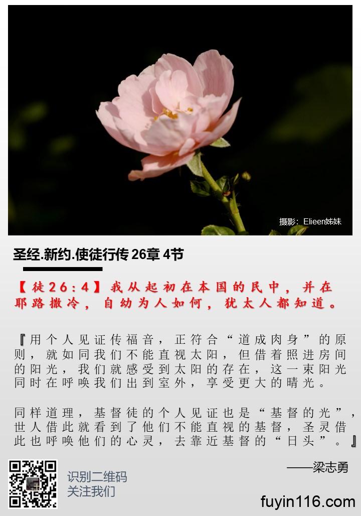 【徒26:4】我从起初在本国的民中,并在耶路撒冷,自幼为人如何,犹太人都知道。 《个人见证的力量》 作者:梁志勇牧师 朗诵:倩文师母 个人见证的力量 (梁志勇) 【徒26:4】我从起初在本国的民中,并在耶路撒冷,自幼为人如何,犹太人都知道。 保罗在亚基帕王面前分辨的时候,从个人见证讲起,并努力向在场的人传福音。他这样的宣讲,是如此有力,完全不像一个被审问的罪犯,以至于亚基帕王后来说“你这样劝我,几乎叫我作基督徒了。”(徒16:28) 我们再看保罗的书信,我们就会发现,他经常分享个人见证,并利用个人见证…