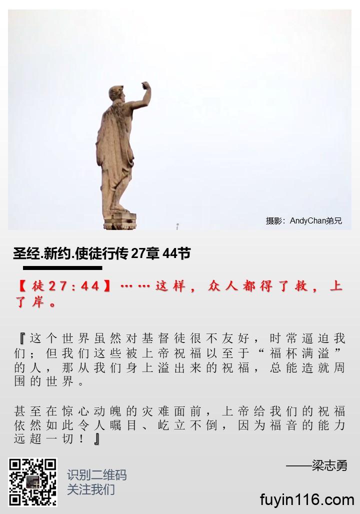 【徒27:44】其余的人可以用板子或船上的零碎东西上岸。这样,众人都得了救,上了岸。 《惊心动魄的海难,屹立不倒的祝福》 作者:梁志勇牧师 朗诵:倩文师母 惊心动魄的海难,屹立不倒的祝福 (梁志勇) 【徒27:44】……这样,众人都得了救,上了岸。 保罗和押解他的人,以及其他囚犯和水手,经历了一场大海难。飓风、饥饿、忧虑、诡计和绝望,曾不断来侵袭这船上的所有人,这些可怕的事情也不断发生在他们身上。这十几天的海上漂泊用惊心动魄来形容,绝不为过。 但正如上帝启示保罗的,他们一个人也没有损失,曾经绝望得饭都…