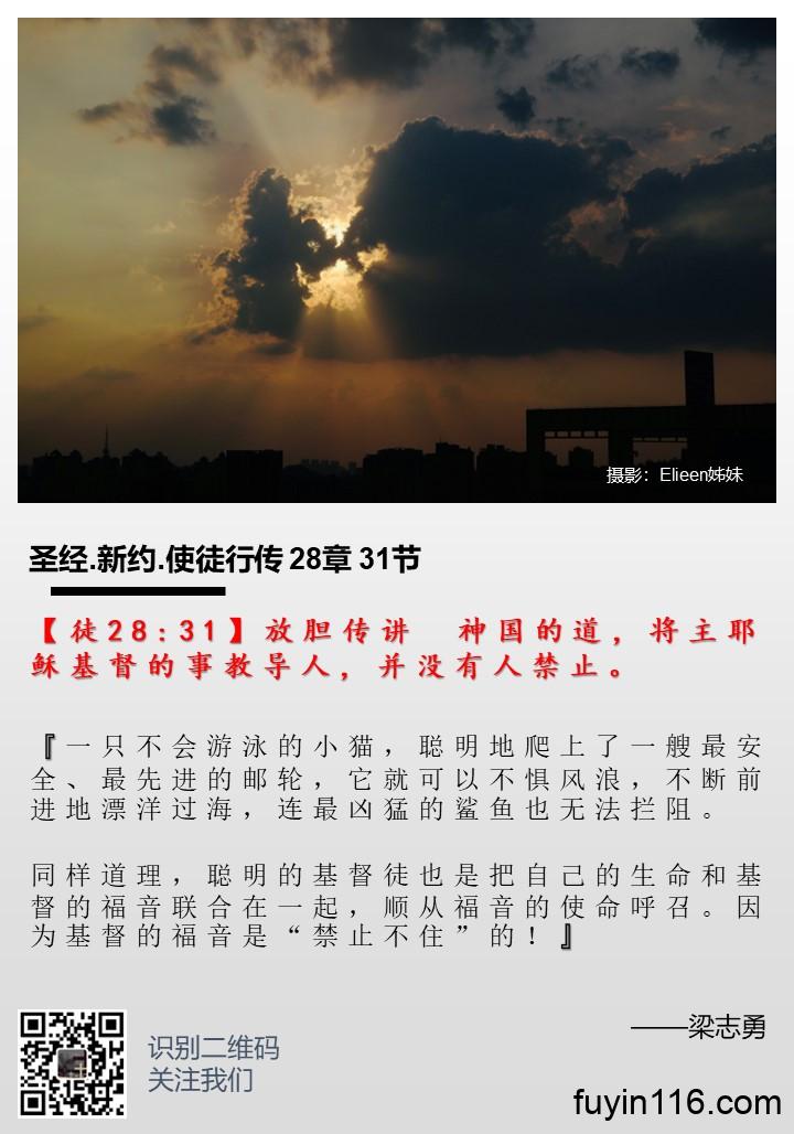 【徒28:31】放胆传讲 神国的道,将主耶稣基督的事教导人,并没有人禁止。 《禁止不住的福音》 作者:梁志勇牧师 朗诵:倩文师母   禁止不住的福音 (梁志勇) 【徒28:31】放胆传讲 神国的道,将主耶稣基督的事教导人,并没有人禁止。 当犹太人诬陷保罗,当他们设计杀害保罗,当他们想方设法把保罗投入监牢,我们知道背后都是魔鬼的诡计,看起来魔鬼这一系列拦阻福音的诡计又恶毒,又猛烈,针对性极强。 福音的工作,看起来要大受影响,甚至可能大大退后了。 但实际的结果呢? 30节说 “保罗在自己所租的房…
