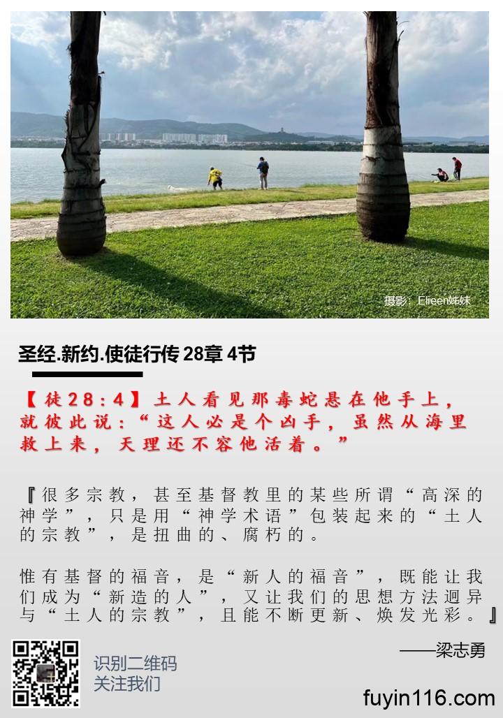 【徒28:4】土人看见那毒蛇悬在他手上,就彼此说:“这人必是个凶手,虽然从海里救上来,天理还不容他活着。” 《土人的宗教,新人的福音》 作者:梁志勇牧师 朗诵:倩文师母 土人的宗教,新人的福音 (梁志勇) 【徒28:4】土人看见那毒蛇悬在他手上,就彼此说:“这人必是个凶手,虽然从海里救上来,天理还不容他活着。” 保罗上岸不久,被毒蛇所咬。这时候,当地土人的反应非常耐人寻味——他们认为,这表明“这人是个凶手,这是天谴”。 同样类似的观念,也出现在约翰福音9章,门徒们面对那个瞎眼的乞丐,说“是谁犯了罪,是…