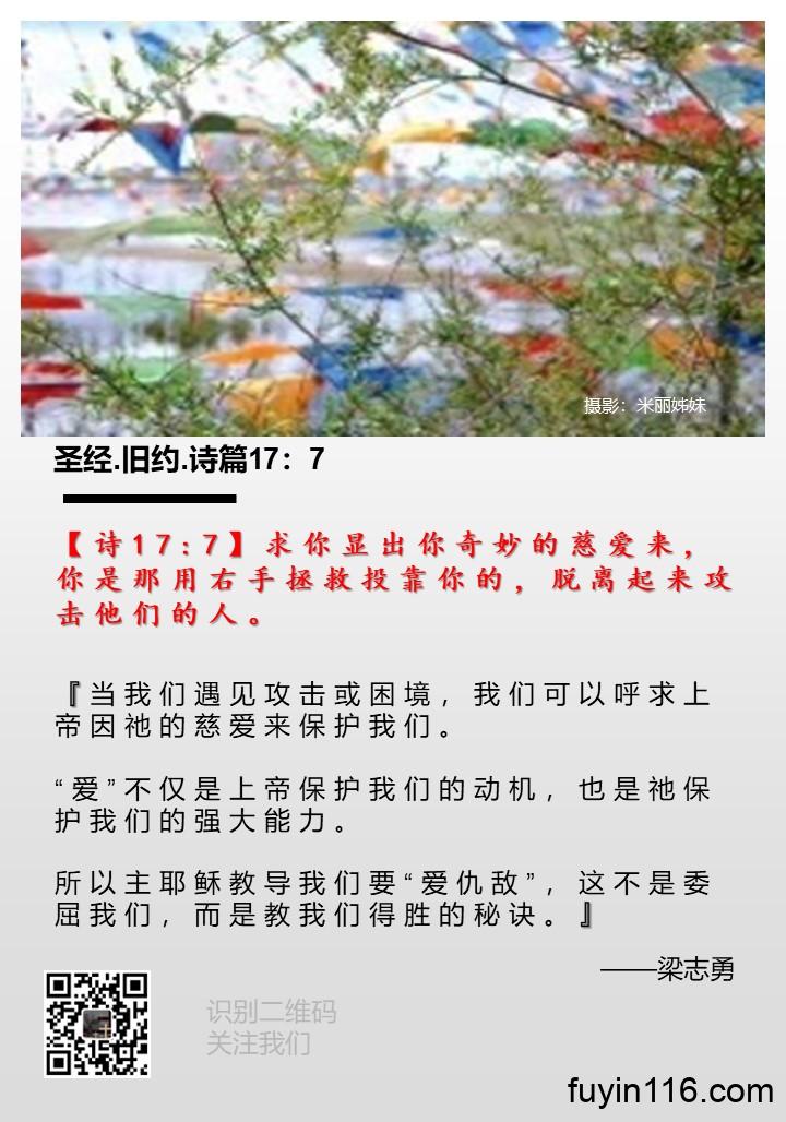 【诗17:7】求你显出你奇妙的慈爱来,你是那用右手拯救投靠你的,脱离起来攻击他们的人。” 《灾难这么多,安康何处得?》 作者:梁志勇牧师 朗诵:徐辉姊妹 【诗17:7】求你显出你奇妙的慈爱来,你是那用右手拯救投靠你的,脱离起来攻击他们的人。 『当我们遇见攻击或困境,我们可以呼求上帝因祂的慈爱来保护我们。 “爱”不仅是上帝保护我们的动机,也是祂保护我们的强大能力。 所以主耶稣教导我们要“爱仇敌”,这不是委屈我们,而是教我们得胜的秘诀。』 主基督耶稣,感谢赞美你 今天是端午节,我们可以利用这个假期休整,也有更多时间在你…