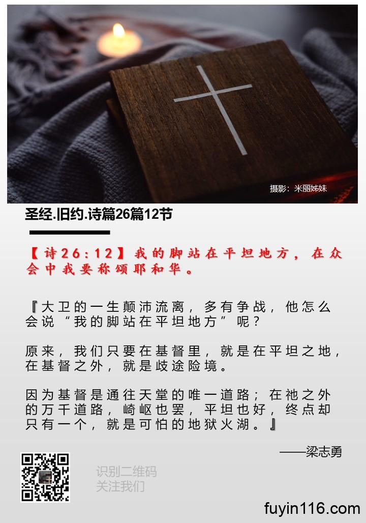 【诗26:12】我的脚站在平坦地方,在众会中我要称颂耶和华。 《在祂里面,都是坦途;在祂之外,只有歧路》 作者:梁志勇牧师 朗诵:徐辉姊妹 【诗26:12】我的脚站在平坦地方,在众会中我要称颂耶和华。 『大卫的一生颠沛流离,多有争战,他怎么会说“我的脚站在平坦地方”呢? 原来,我们只要在基督里,就是在平坦之地,在基督之外,就是歧途险境。 因为基督是通往天堂的唯一道路; 在祂之外的万千道路,崎岖也罢,平坦也好,终点却只有一个,就是可怕的地狱火湖。』 主耶稣基督,感谢赞美你 感谢你赐给我们圣经,让我们能明…