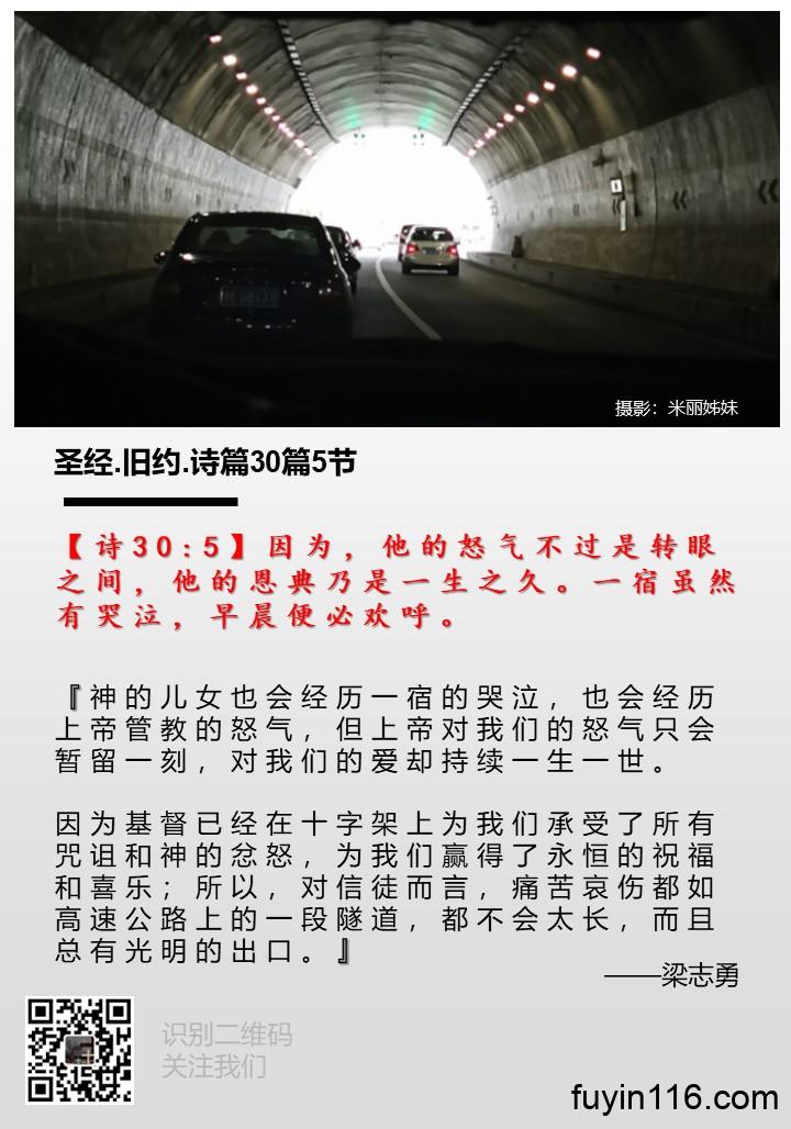 【诗30:5】因为,他的怒气不过是转眼之间,他的恩典乃是一生之久。一宿虽然有哭泣,早晨便必欢呼。 《看,隧道尽头的光!》 作者:梁志勇牧师 朗诵:徐辉姊妹 【诗30:5】因为,他的怒气不过是转眼之间,他的恩典乃是一生之久。一宿虽然有哭泣,早晨便必欢呼。 『神的儿女也会经历一宿的哭泣,也会经历上帝管教的怒气,但上帝对我们的怒气只会暂留一刻,对我们的爱却持续一生一世。 因为基督已经在十字架上为我们承受了所有咒诅和神的忿怒,为我们赢得了永恒的祝福和喜乐; 所以,对信徒而言,痛苦哀伤都如高速公路上的一段隧道,…