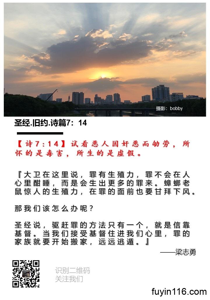 【诗7:14】试看恶人因奸恶而劬劳,所怀的是毒害,所生的是虚假。 《可怕的生殖力》 作者:梁志勇牧师 朗诵:徐辉姊妹 【诗7:14】试看恶人因奸恶而劬劳(读音:qúláo),所怀的是毒害,所生的是虚假。 『大卫在这里说,罪有生殖力,罪不会在人心里酣睡,而是会生出更多的罪来。蟑螂老鼠惊人的生殖力,在罪的面前也要甘拜下风。 那我们该怎么办呢? 圣经说,驱赶罪的方法只有一个,就是信靠基督。当我们接受基督住进我们心里,罪的家族就要开始搬家,远远逃遁。』 我们在天上的父,我们感谢和赞美你, 你深爱我们,不仅把丰盛的恩典赐给我…