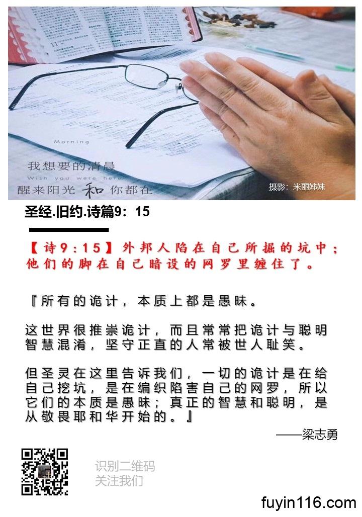 【诗9:15】外邦人陷在自己所掘的坑中;他们的脚在自己暗设的网罗里缠住了。 《诡计的本质,乃是愚昧》 (作于 2020年5月) 作者:梁志勇牧师 朗诵:徐辉姊妹 【诗9:15】外邦人陷在自己所掘的坑中;他们的脚在自己暗设的网罗里缠住了。 『所有的诡计,本质上都是愚昧。这世界很推崇诡计,而且常常把诡计与聪明智慧混淆,坚守正直的人常被世人耻笑。 但圣灵在这里告诉我们,一切的诡计是在给自己挖坑,是在编织陷害自己的网罗,所以它们的本质是愚昧。 真正的智慧和聪明,是从敬畏耶和华开始的。』 我们在天上的父,我们感…