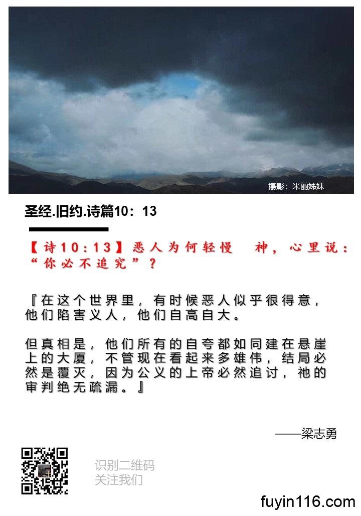 【诗10:13】恶人为何轻慢 神,心里说:“你必不追究”? 《建在悬崖上的大厦》 作者:梁志勇牧师 朗诵:徐辉姊妹 【诗10:13】恶人为何轻慢 神,心里说:“你必不追究”? 『在这个世界里,有时候恶人似乎很得意,他们陷害义人,他们自高自大。 但真相是,他们所有的自夸都如同建在悬崖上的大厦,不管现在看起来多雄伟,结局必然是覆灭,因为公义的上帝必然追讨,祂的审判绝无疏漏。』 我们在天上的父,我们感谢和赞美你, 你的话语充满了能力,能安慰人心;充满了天堂的光明,可以驱散我们心中的阴霾。 在这个世界里,我们常常看到不认识…