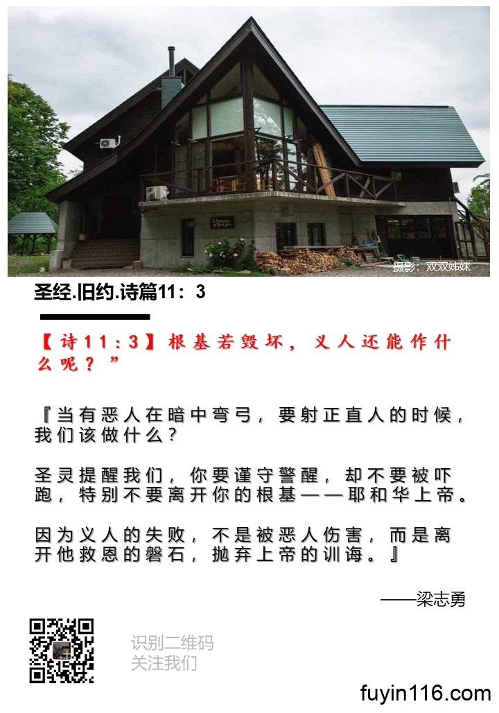【诗11:3】根基若毁坏,义人还能作什么呢?” 《恶人逼迫基督徒的最重要目的是什么?》 作者:梁志勇牧师 朗诵:徐辉姊妹 【诗11:3】根基若毁坏,义人还能作什么呢?” 『当有恶人在暗中弯弓,要射正直人的时候,我们该做什么? 圣灵提醒我们,你要谨守警醒,却不要被吓跑,特别不要离开你的根基——耶和华上帝。 因为义人的失败,不是被恶人伤害,而是离开他救恩的磐石,抛弃上帝的训诲。』 我们在天上的父,我们感谢和赞美你, 你的话语有最深刻的洞察力,你完全晓得我们信徒的需要,也完全看穿我们仇敌的一切诡计。 在诗篇的第11篇,你…