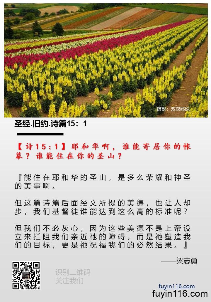 【诗15:1】耶和华啊,谁能寄居你的帐幕?谁能住在你的圣山?” 《不是拦阻,而是目标》 作者:梁志勇牧师 朗诵:徐辉姊妹 【诗15:1】耶和华啊,谁能寄居你的帐幕?谁能住在你的圣山? 『能住在耶和华的圣山,是多么荣耀和神圣的美事啊。 但这篇首诗篇后面经文提到的各种美德,却让人望而却步,谁能达到这么高的标准呢? 但让我们不要灰心,因为这些美德不是上帝拦阻我们亲近祂的障碍,而是祂指引我们成长的方向,更是祂祝福我们的必然结果!』 主耶稣基督,感谢赞美你 感谢你把诗篇15篇赐给我们,这是一首极美的诗篇,能滋润…