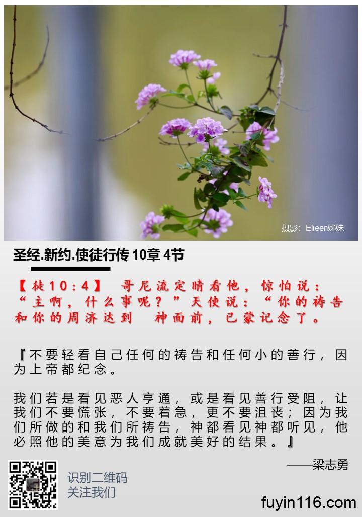 【徒10:4】 哥尼流定睛看他,惊怕说:“主啊,什么事呢?”天使说:“你的祷告和你的周济达到 神面前,已蒙记念了。 《谁听我的祷告?谁看我的善行?》 作者:梁志勇牧师 朗诵:倩文师母 谁听我的祷告?谁看我的善行? (梁志勇) 【徒10:4】 哥尼流定睛看他,惊怕说:“主啊,什么事呢?”天使说:“你的祷告和你的周济达到 神面前,已蒙记念了。 这是一段特别甘甜、又特别能安慰人的经文。 外邦人哥尼流的善行和祷告,被上帝所纪念,并被上帝使用,改变了耶路散冷教会对福音的理解。  让我们仔细去思想,反复咀嚼,从这…