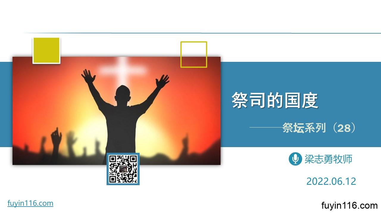 在6月12日,我们将分享《祭坛系列》的最后一讲: 《祭司的国度》 让我们听听上帝在这系列信息的最后一讲,祂要给我们哪些重要的提醒: 上帝拯救我们,使我们成为“祭司的国度”,祂的深意是什么? “祭司的国度”和主耶稣基督,有什么关系? “祭司的国度”与侍奉,又有什么关系? “祭司的国度”与福音大使命之间,有什么密切联系?   【出19:3】摩西到 神那里,耶和华从山上呼唤他说:“你要这样告诉雅各家,晓谕以色列人说: 【出19:4】‘我向埃及人所行的事,你们都看见了;且看见我如鹰将你们背在翅膀上,带来归我。 【…