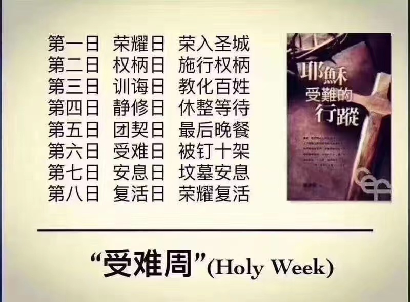 我们知道,基督教会有一个美好的传统,就是在复活节前一周,就是受难周,默想主基督的救恩,按照主基督从荣入圣城的那一天开始,到上十字架、受死、复活,总共8天,每天一个主题,帮助圣徒更清晰地看见救主基督。 这八天分别是:   第一日 荣耀日(周日) 第二日 权柄日(周一) 第三日 训诲日(周二) 第四日 安静日(周三) 第五日 团契日(周四) 第六日 受难日(周五) 第七日 安息日(周六) 第八日 复活日(周日)   这个总计8天受难周的默想,在近两千年的教会历史中,激励了亿亿万万的基督…